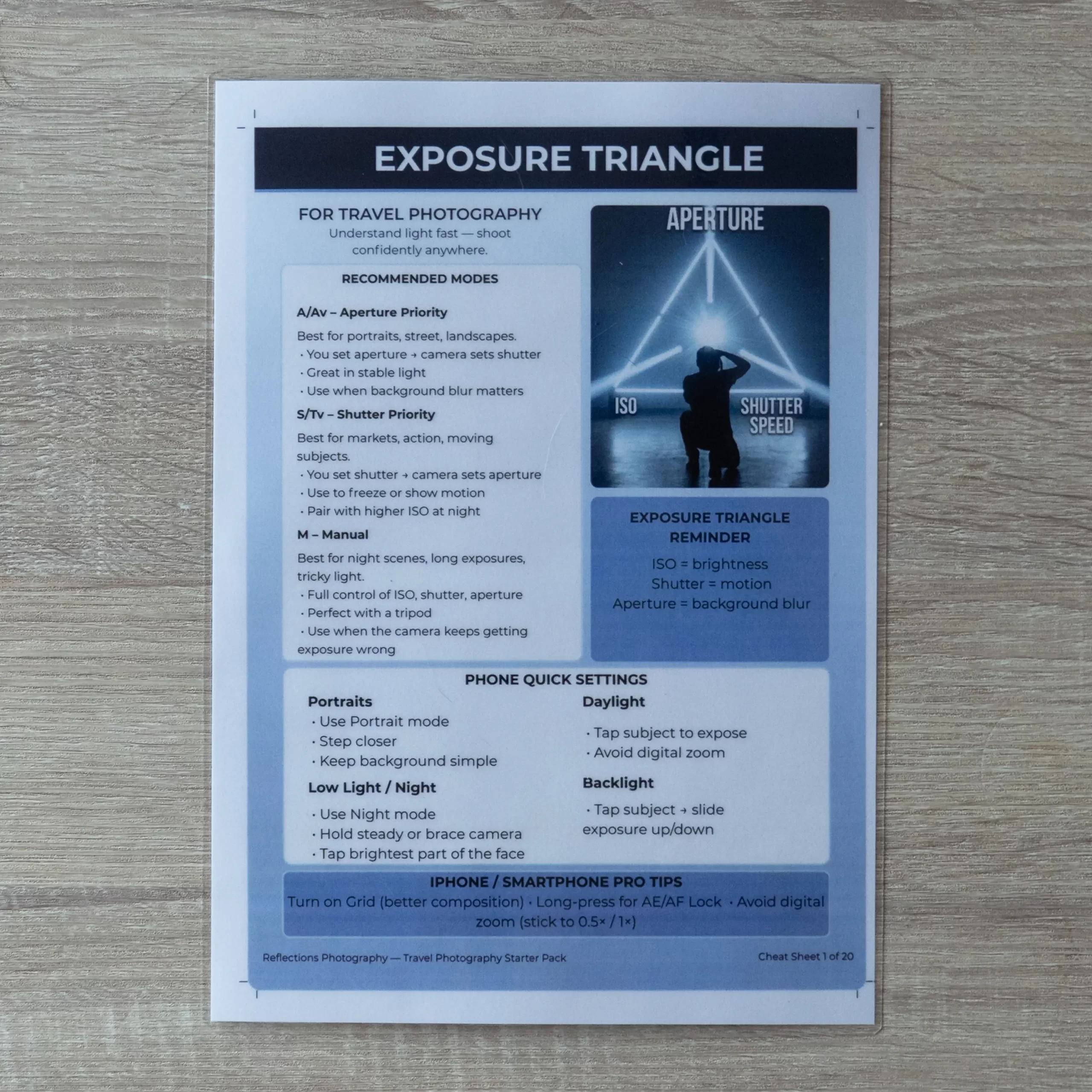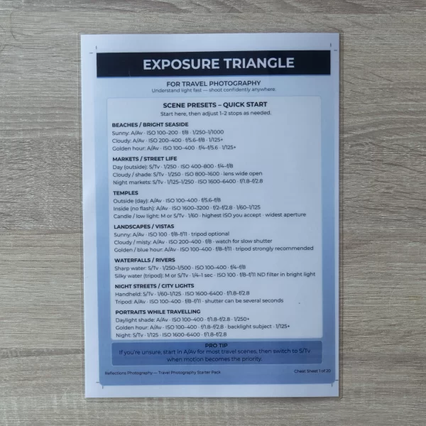 This cheat sheet is designed to make the exposure triangle practical. It gives you a simple way to decide what matters most in the moment, so you can set a baseline quickly and then make one smart change at a time. The goal isn’t to turn you into a technician. The goal is to help you get the photo, consistently, across the messy reality of travel.