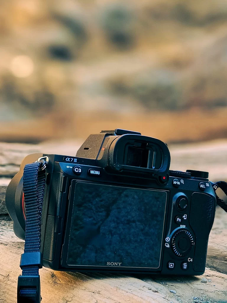 Sony mirrorless camera resting on a wooden log outdoors – Reflections Photo Coach